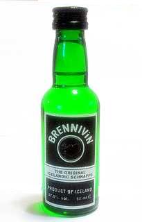 話說回來,我是如何嚐到那難以忘記的味道的呢? 那天,在雷克雅未克的超市內,看到了那包切成約一公分見方的白色東東,覺得很眼熟,跟旅遊節目中介紹的名產長得很像,可是實在無法從只有冰島文的包裝上找到認識的字眼(就是那個S開頭的英文字啦),所以就給它略過去了,沒想到在結帳時赫然發現它躺在購物籃裡,原來老弟也看到了那包,他決定賭賭看! 當晚在住宿的地方吃飯時,Y一直慫恿老弟打開那一包,老弟說沒有準備酒所以不開來吃,準備什麼酒?節目都是這樣演的啦,他堅持要有酒才要打開來吃。第二天去格陵蘭時,眼尖的我正巧在機場的免稅店看到冰島的另一項名產(如下圖)Brennivin酒,是用馬鈴薯發酵蒸餾的烈酒,酒精濃度37.5%,又戲稱為黑死病(Black death),小瓶(50ml)包裝,一瓶冰幣200元,送人自用兩相宜,在KEF機場也有賣。