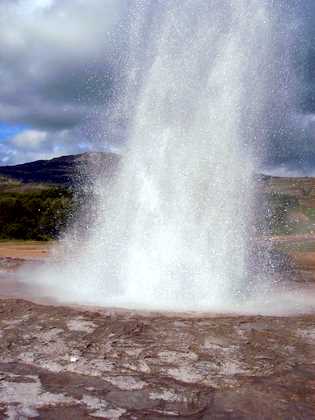 間歇泉是冰島金圈之旅中必報到的景點之一,Geysir,冰島語是「噴出」的意思,英國人登入冰島後第一次看到間歇泉,因此英語的Geyser語源就是來自冰島文Geysir。Geysir間歇泉噴出的高度約有60~70公尺高,但從西元1915年後就呈現持續休止的狀態,在1935年雖然又再活動但之後仍持續休止好幾年,直到2000年冰島南部發生大地震,於是Geysir又開始動了起來,但現在噴發的間隔變得比以前長,噴泉也沒以往高了。在Geysir這一區有十個以上的間歇泉,目前此區最活躍的間歇泉是Strokkur間歇泉,Strokkur冰島語是「攪拌」的意思,每隔7~8分鐘便會噴出約高30公尺的噴泉,已成為此區間歇泉中的主角。